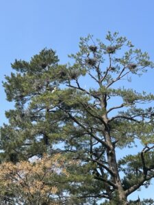 まず印象に残ったのは、松の上に巣をつくるアオサギの姿だった。