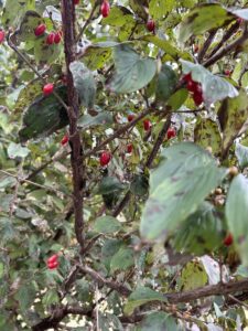 漢方でも使用されるサンシュユの実。赤くて艶々していて綺麗です。形はハナミズキに似てますかね?