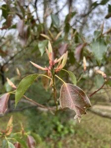 古い葉は深い緑色をしているのに、新芽だけが驚くほど鮮やかな赤色をしています。そのコントラストは、まるでお能の装束の襲(かさね)を見ているかのよう。近づくと小さな蕾がたくさんついていて、これから白い花を咲かせる準備に余念がないことがわかります。
