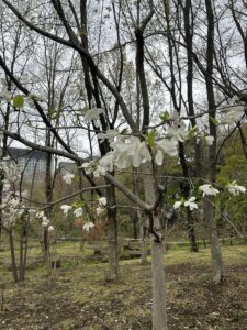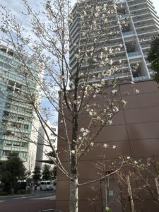 ハクモクレンコブシは、葉が出る前、あるいは出始めのタイミングで花を咲かせるため、枝の先に白だけが浮かんで見えます。